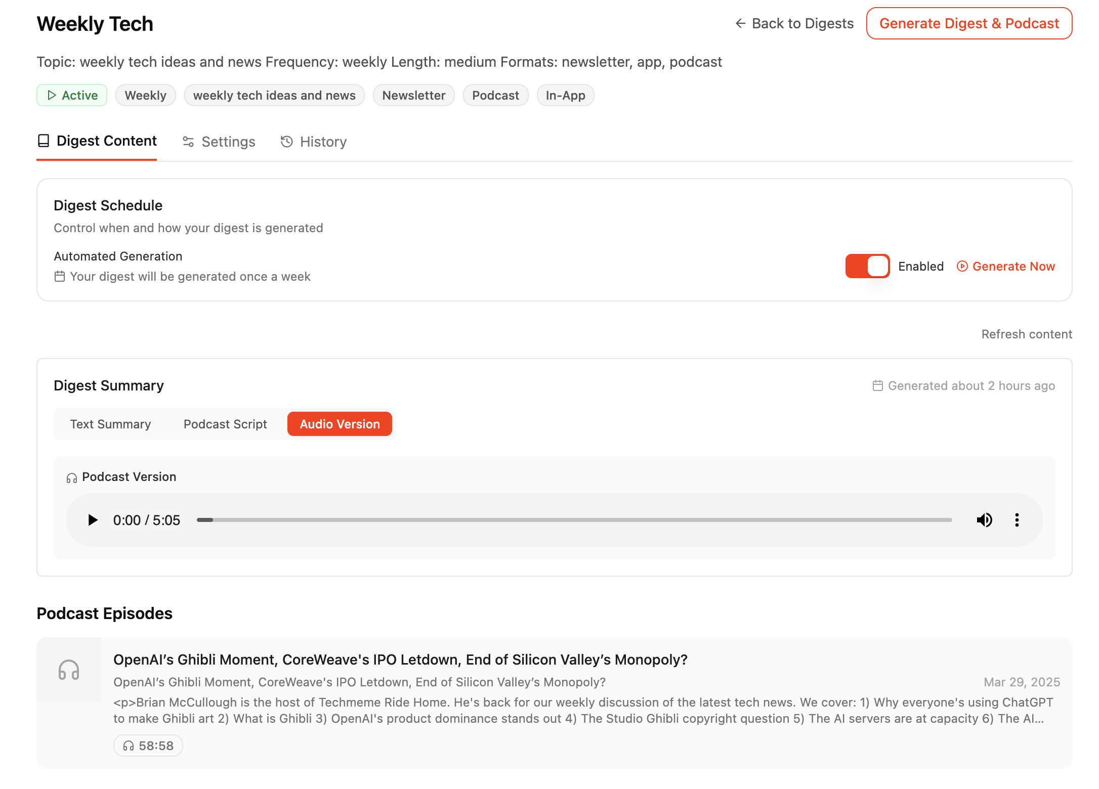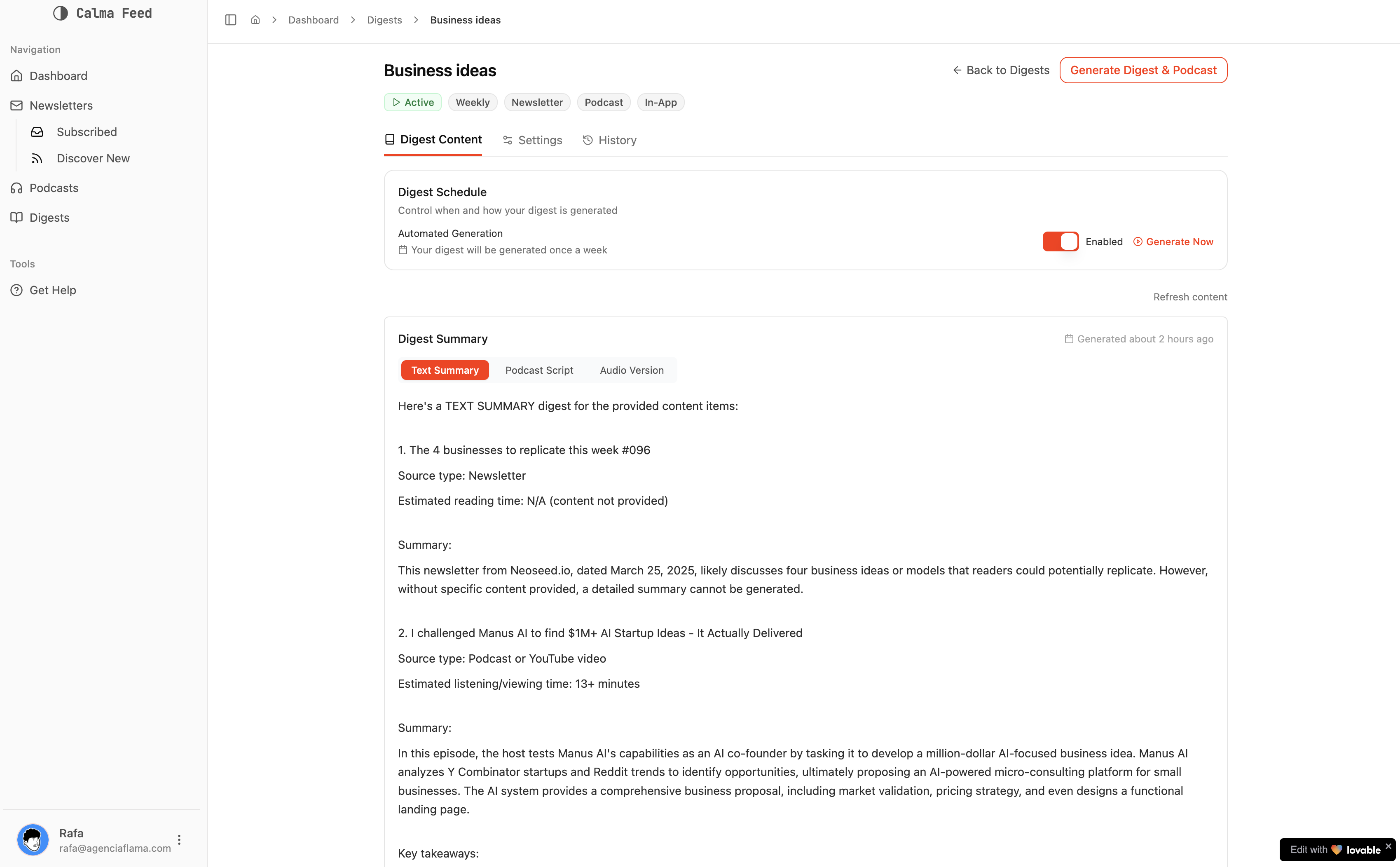 RMCalma Feedrafa maker|Publicado el 8 de abril de 2025 CompartirDescripciónTransforma tus newsletters y podcasts favoritos en un feed semanal resumido, mediante una sola newsletter o un podcast de 5 minutos.Imagen principalImágenes Adicionales