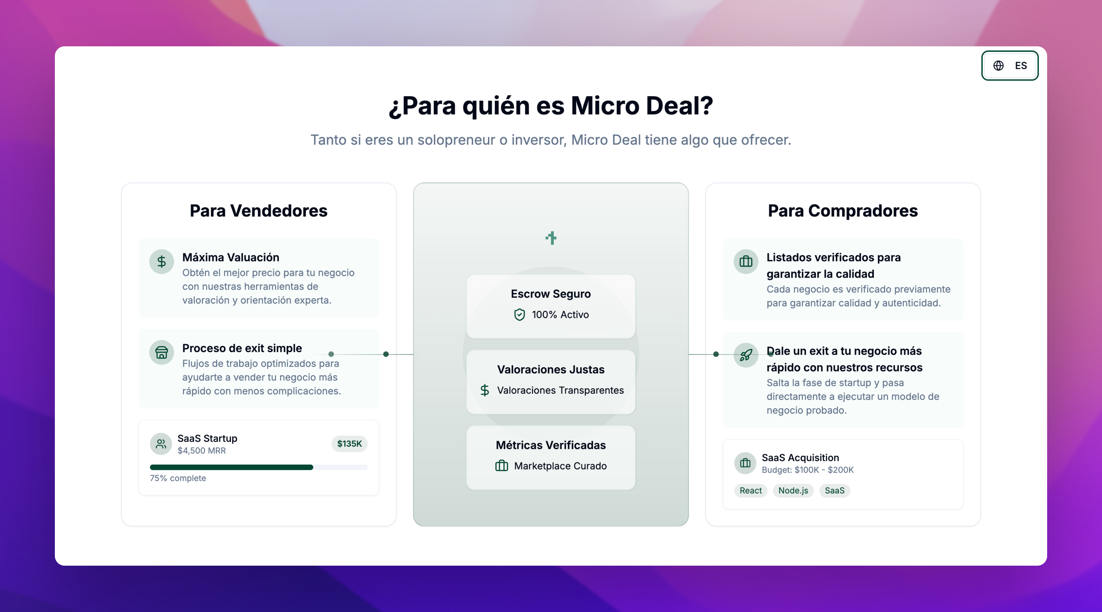 Micro Deal es un marketplace especializado en la compra y venta de micro-SaaS bootstrapped y otros micro-negocios digitales. Todo sucede dentro de la plataforma: incluye escrow integrado, cálculo automático de métricas clave y verificación de usuarios. Antes de publicarse, cada listing pasa por un proceso de revisión y due diligence. En Micro Deal encontrarás SaaS, newsletters, e-commerce, apps móviles, web apps, extensiones, agentes de IA, chatbots y más—todos con tracción demostrada e ingresos previos. ¿Quieres vender tu proyecto? Puedes lograr hasta x5 veces su valuación. Hecho con ❤️ por y para Indie makers en hispanohablantes.