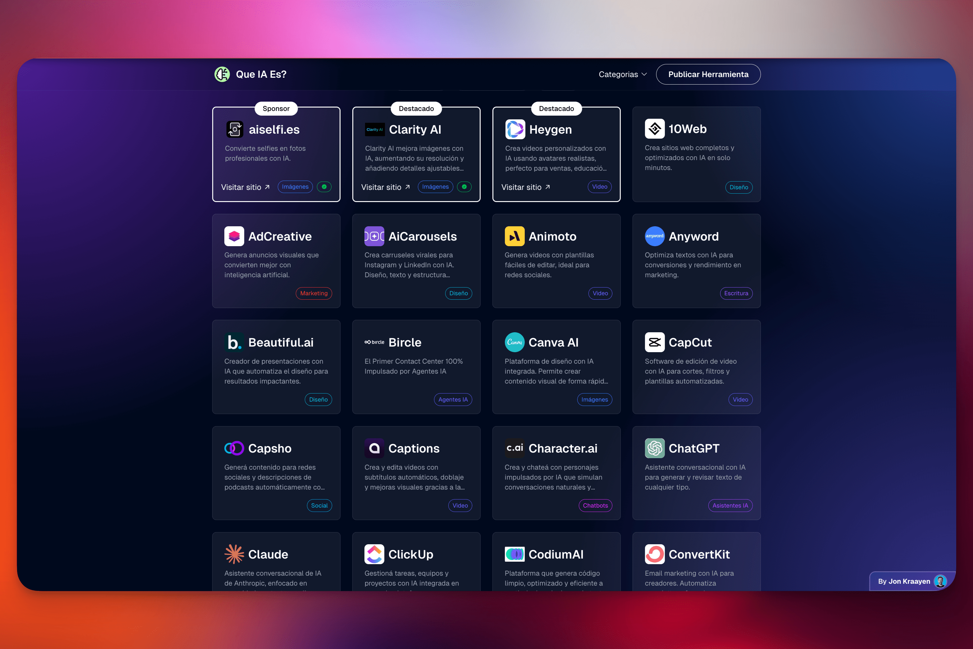 Que IA Es? es un directorio curado, actualizado y 100% en español que reúne las mejores herramientas de IA para cualquier necesidad. Si sos creador, emprendedor o simplemente curioso, acá encontrás lo que necesitás - sin perder tiempo y sin barreras de idioma.
